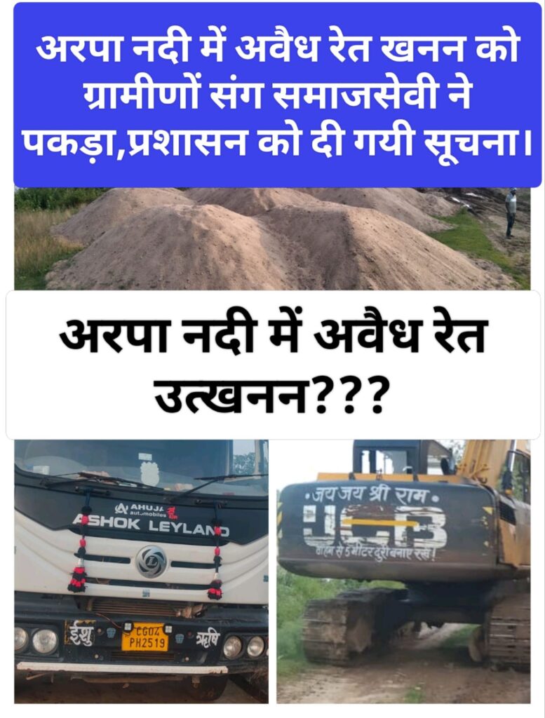 अरपा नदी में अवैध रेत खनन को ग्रामीणों संग समाजसेवी ने पकड़ा,प्रशासन को दी गयी सूचना।