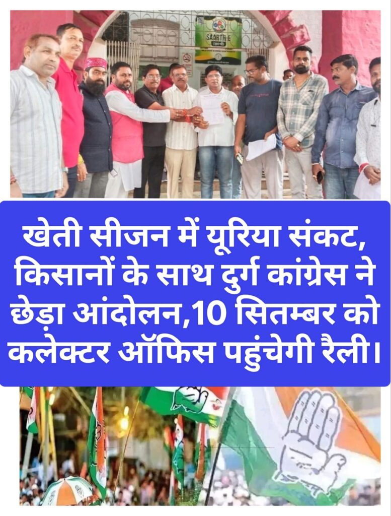 खेती सीजन में यूरिया संकट, किसानों के साथ दुर्ग कांग्रेस ने छेड़ा आंदोलन,10 सितम्बर को कलेक्टर ऑफिस पहुंचेगी रैली।