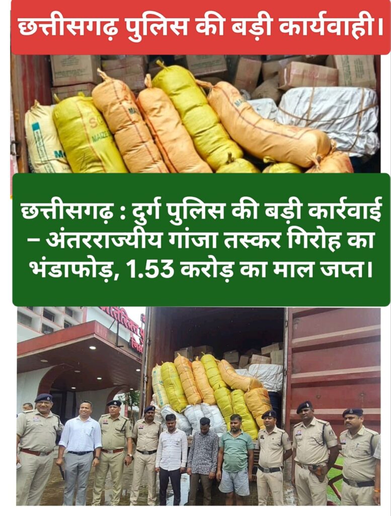 छत्तीसगढ़ : दुर्ग पुलिस की बड़ी कार्रवाई – अंतरराज्यीय गांजा तस्कर गिरोह का भंडाफोड़, 1.53 करोड़ का माल जप्त।