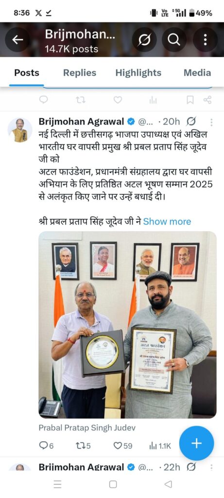 अखिल भारतीय घरवापसी प्रमुख प्रबल प्रताप सिंह जूदेव को मिला “अटल भूषण पुरस्कार”