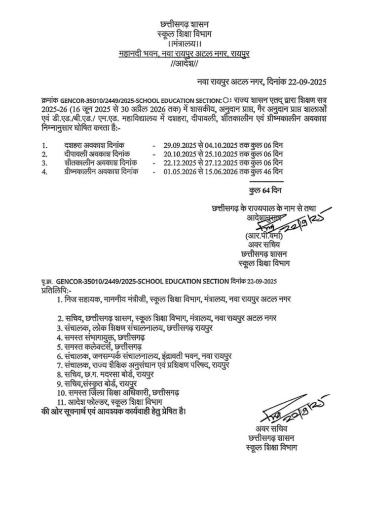 छत्तीसगढ़ शासन ने जारी की स्कूलों की छुट्टियों की सूची, कुल 64 दिन रहेंगे अवकाश, शैक्षणिक सत्र 2025-26 के लिए घोषित हुई छुट्टियां – देखिए पूरा कैलेंडर।