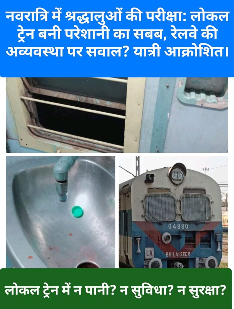 नवरात्रि के अवसर पर डोंगरगढ़ से लेकर बिलासपुर तक बड़ी संख्या में श्रद्धालु यात्रा करते हैं। लेकिन इस पावन अवसर पर लोकल ट्रेनों की दुर्दशा ने श्रद्धालुओं की आस्था और धैर्य की कठिन परीक्षा ले ली है।