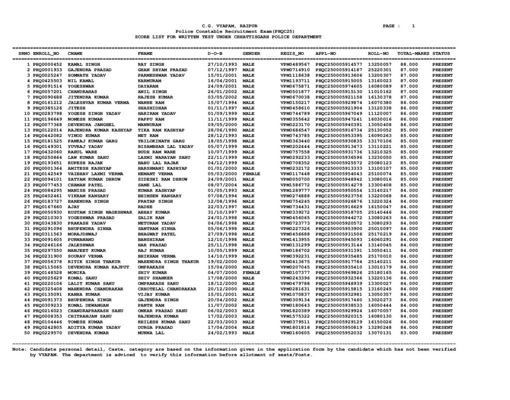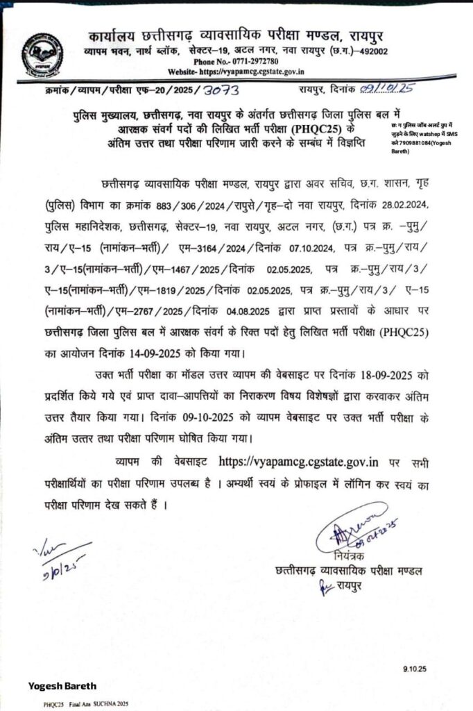छत्तीसगढ़ व्यावसायिक परीक्षा मण्डल (व्यापम) ने छत्तीसगढ़ जिला पुलिस बल में आरक्षक संवर्ग के रिक्त पदों हेतु आयोजित लिखित भर्ती परीक्षा (PHQC25) का अंतिम उत्तर एवं परीक्षा परिणाम आज दिनांक 09 अक्टूबर 2025 को जारी कर दिया है।