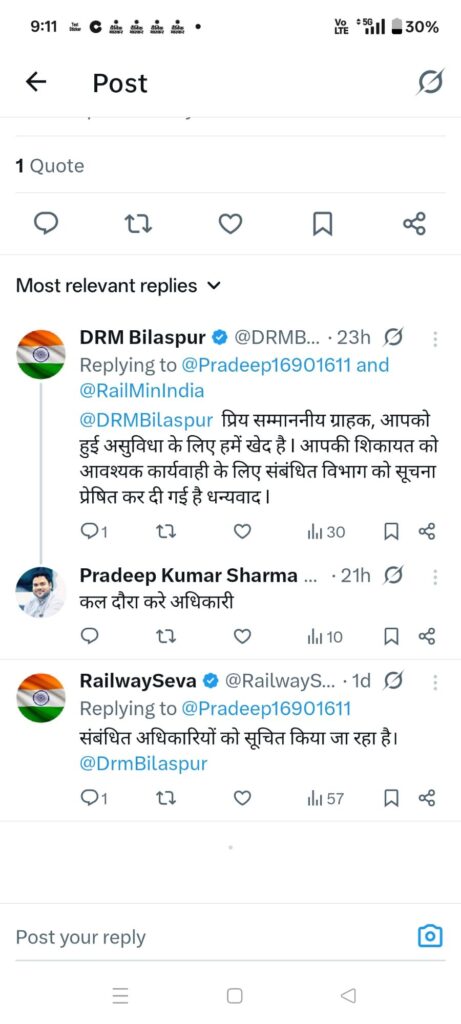 इस गंभीर समस्या को लेकर रेल मंत्रालय, माननीय रेल मंत्री और DRM बिलासपुर को ट्विटर (X) के माध्यम से शिकायत भी की गई है। बावजूद इसके अब तक रेलवे प्रशासन की ओर से न तो स्पष्ट जवाब आया है और न ही वैकल्पिक व्यवस्था की गई है, जिससे लोगों में नाराजगी और बढ़ गई है।