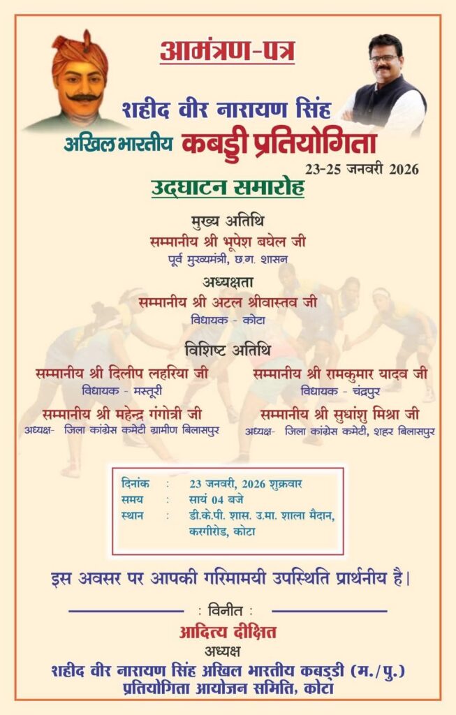 शहीद वीर नारायण सिंह की स्मृति में अखिल भारतीय कबड्डी प्रतियोगिता का आयोजन 23 से 25 जनवरी 2026 तक कोटा में किया जा रहा है। इस तीन दिवसीय प्रतिष्ठित खेल आयोजन का उद्घाटन समारोह 23 जनवरी 2026 (शुक्रवार) को सायं 4 बजे आयोजित होगा।