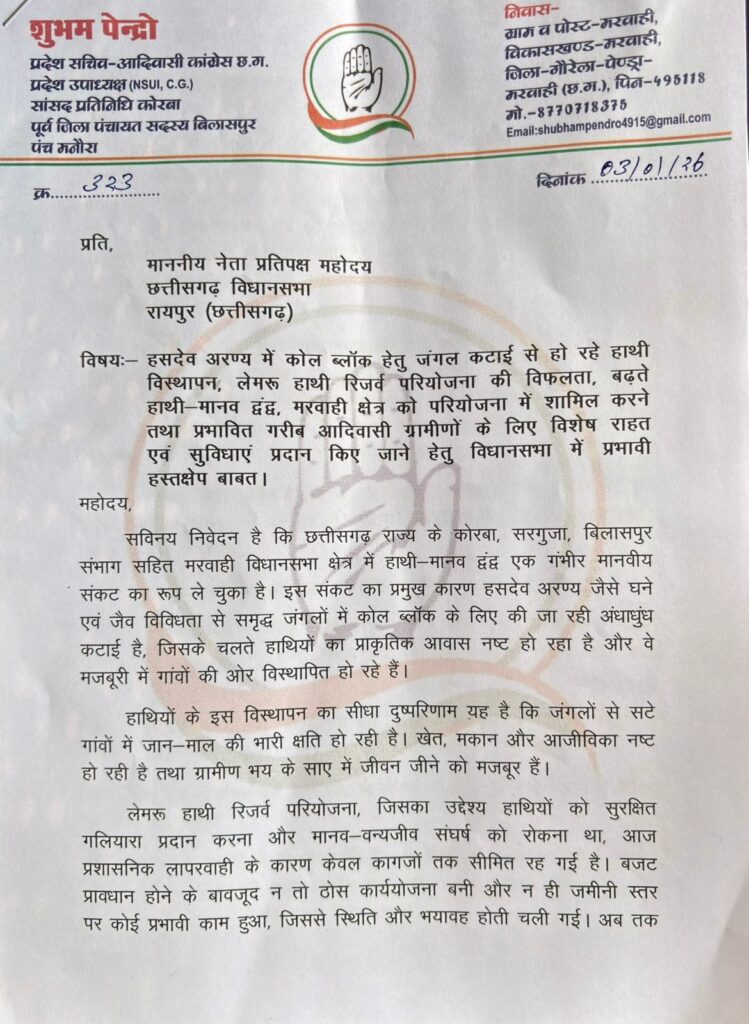 हसदेव अरण्य बचाने NSUI प्रदेश उपाध्यक्ष शुभम पेन्द्रों का बड़ा कदम-नेता प्रतिपक्ष को पत्र लिखकर हाथी–मानव संघर्ष, जंगल कटाई और आदिवासी सुरक्षा पर उठाई आवाज।
